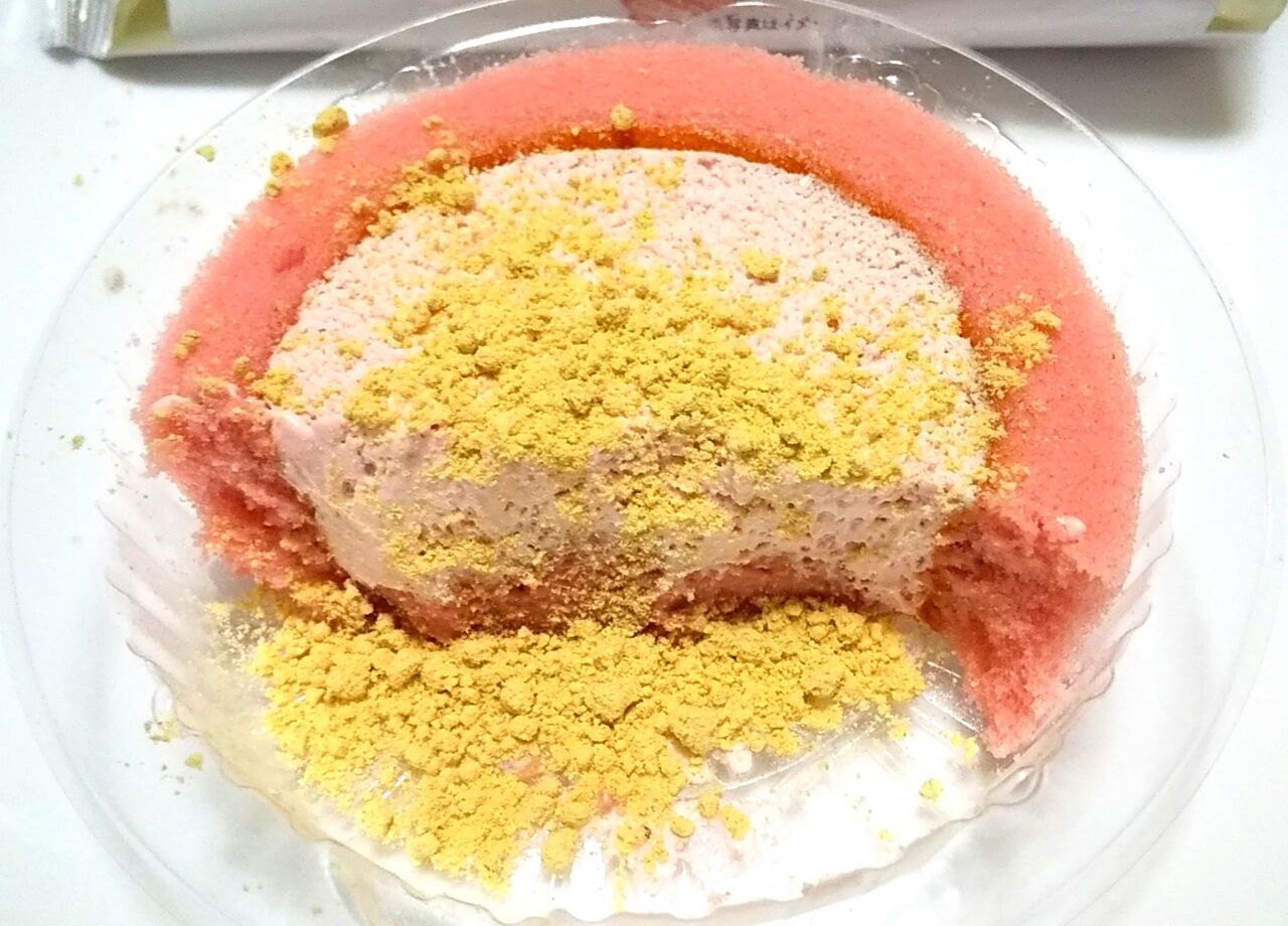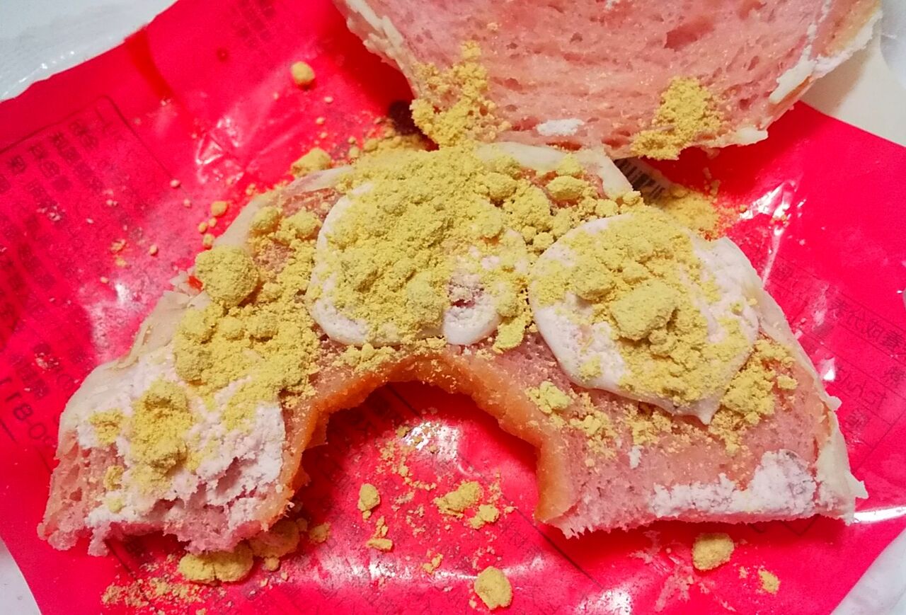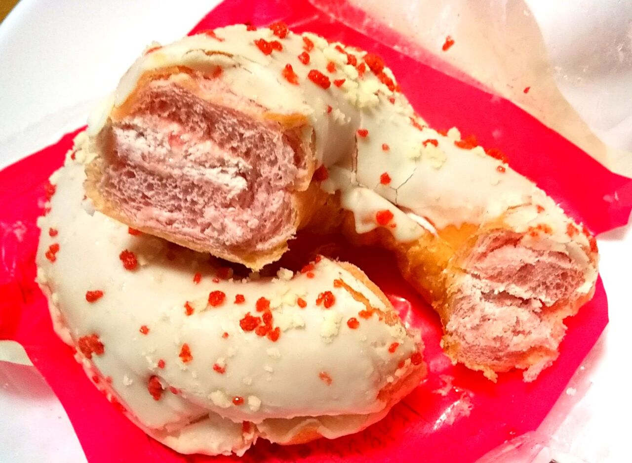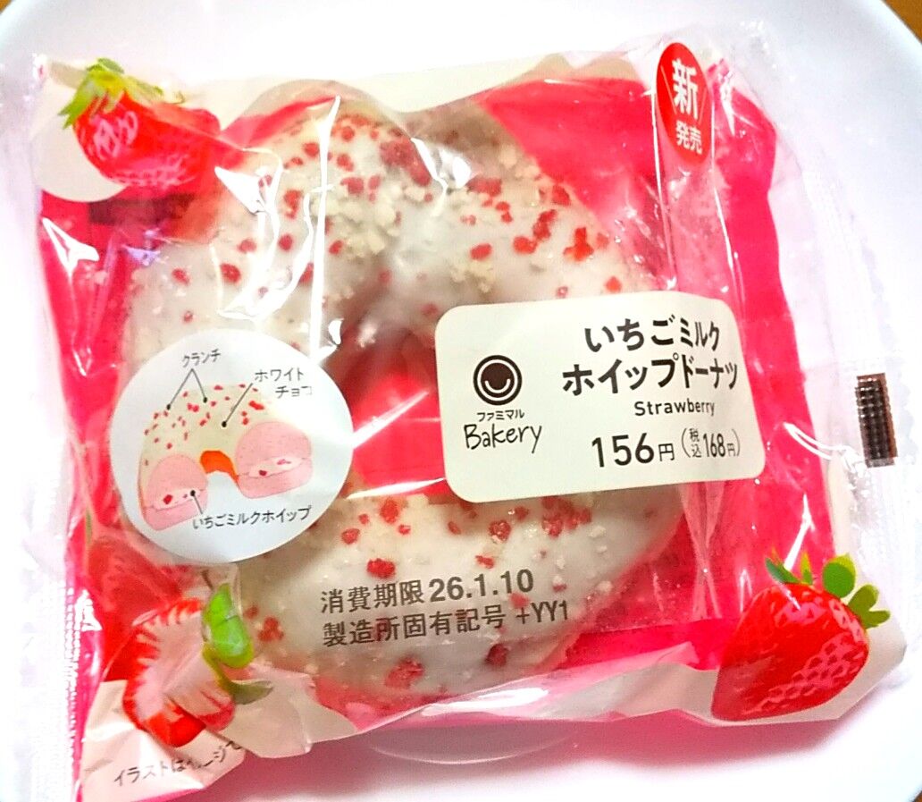 ピンク色のドーナツ生地にいちご果肉入りミルクホイップをサンドし、上からホワイトチョココーティングと2種類のクランチをトッピングしました。ファミマ公式サイトより