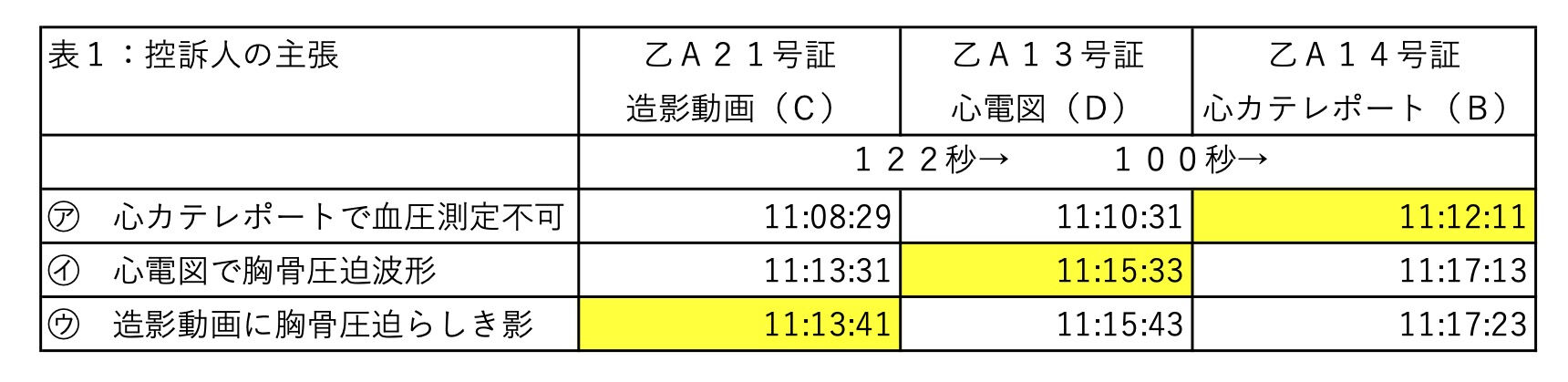 証言台に立った担当医は、心カテレポート、冠動脈造影動画、十二誘導心電図に表示されている時刻は一致している、自分はこの施術の直後に一致していることを確認した、と証言しました。これに対して原告側は、看護レポートを作成した看護師の証言から、看護レポートと心カテレポートの時刻のズレ及び看護レポートと造影動画の時刻のズレをそれぞれ算出し、推理小説の時刻表トリックを解明するような作業を経て、心カテレポートの時刻と冠動脈造影動画の時刻との間には3分42秒(222秒)のズレがあるとの結論を導き出しました。これによれば、被告の主張で1分30秒であった血圧測定不可と胸骨圧迫開始の時間間隔は、実は5分12秒も開いているということになります。