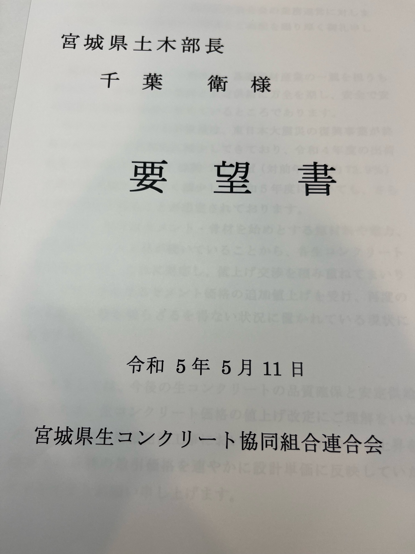 º£Æü¤Ï¡¢µÜ¾ë¸©À¸¥³¥ó¥¯¥ê¡¼¥È¹©¶ÈÁȹ硢µÜ¾ë¸©À¸¥³¥ó¥¯¥ê¡¼¥È¶¦Æ±ÁȹçÏ¢¹ç²ñ¤ÎÅÚÌÚÉôĹ¤Ø¤ÎÍ×˾²ñ¤ËƱÀʤ·¤Þ¤·¤¿¡£
