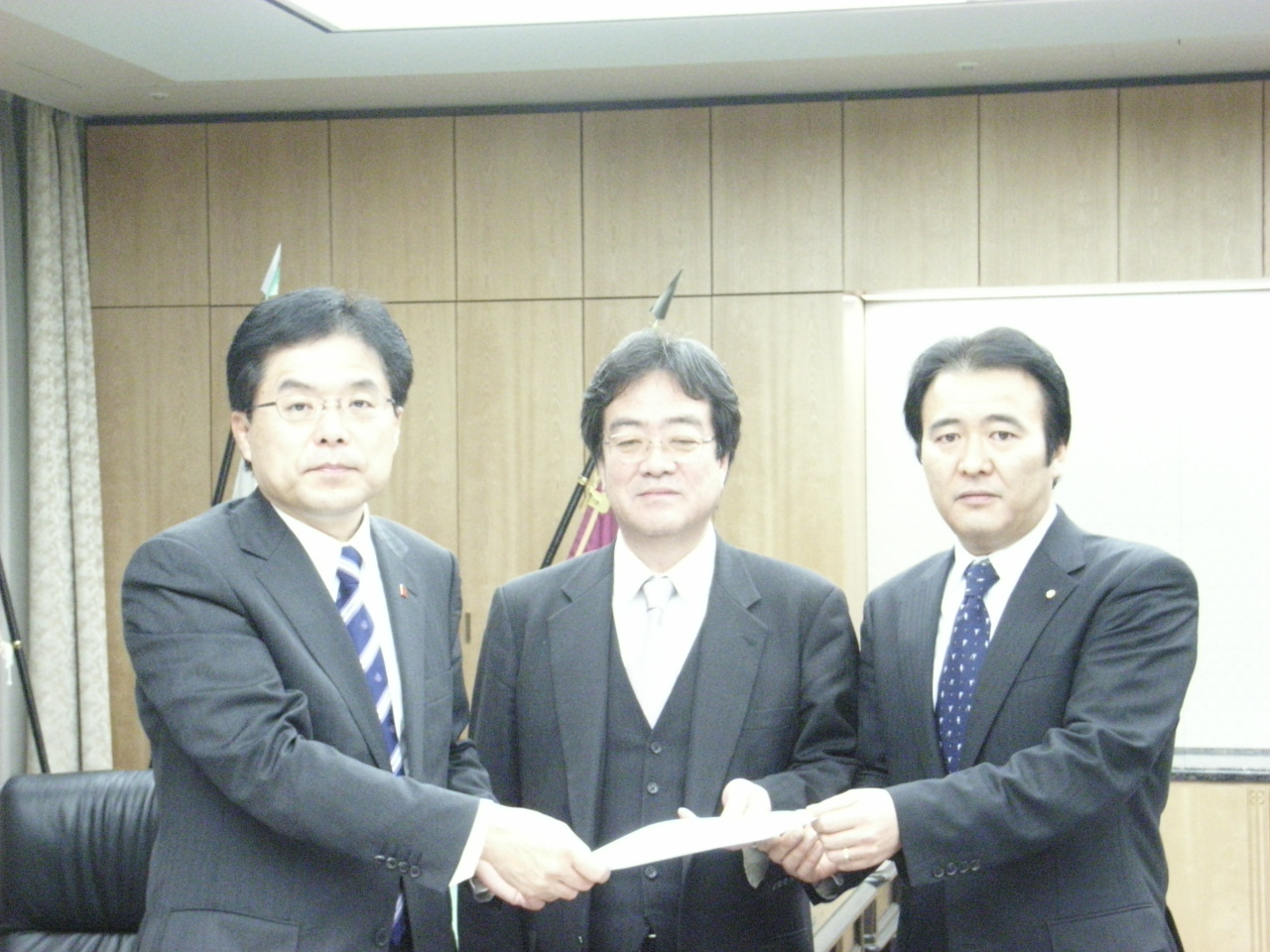 2007年12月19日 総務大臣 昨日、宮城・岩手県境議連として、地方の自立を求める、地方税財源の充実強化、情報通信基盤の整備などの要望のため総務省へ行ってきました。ちょうど財務大臣との最終調整の直後の増田大臣に面会し、最新の情報を聞くことができました。心配された発展税への影響は特別枠などで対応するそうです。税財源の確保については、額はそんなに大規模でありませんが、これまで減り続けてきた交付税に歯止めがかかり、一般財源が増えることになりそうです。 佐々木岩手県議連の会長と増田総務大臣です。