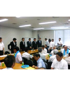 2008年07月15日 お願いします 大会の後で、宮城県の水産関係者は衆議院議員会館に集合、県選出の国会議員団との意見交換をしました。その後、財源問題解決のため、二階総務会長、大島国対委員長と面談今仙台に戻っています。