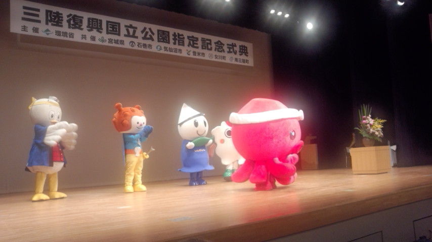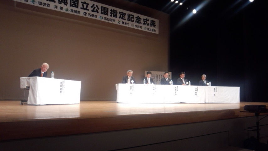 2015年05月23日 復興国立公園 訓練を終えてから、環境省主催の「三陸復興国立公園指定」記念式典に出席のため石巻市河北総合センタービックバンに向かいました。以前の陸中海岸国立公園の範囲が八戸市から石巻市まで広がり指定されものです。豊かな自然景観の保全だけでなく、津波など自然の脅威を学ぶための取り組みも始まるようです。三陸地域の復興に貢献することを目指して復興公園と命名されたそうです。公園を抱えるそれぞれの市町の首長による、未来に向けての取り組みについてのパネルディスカッションもありました。