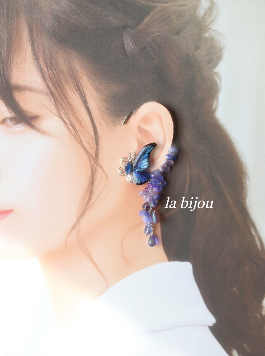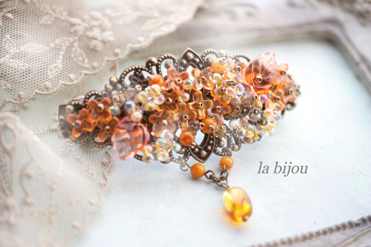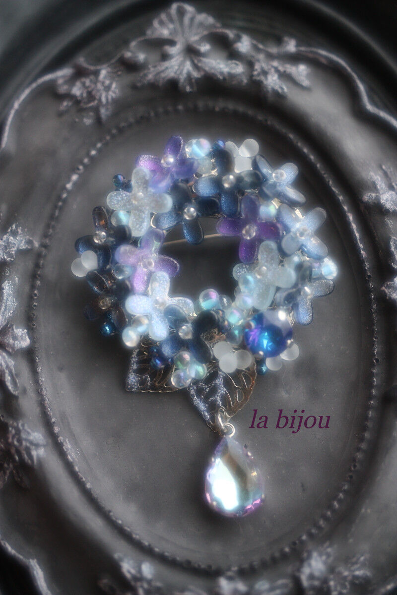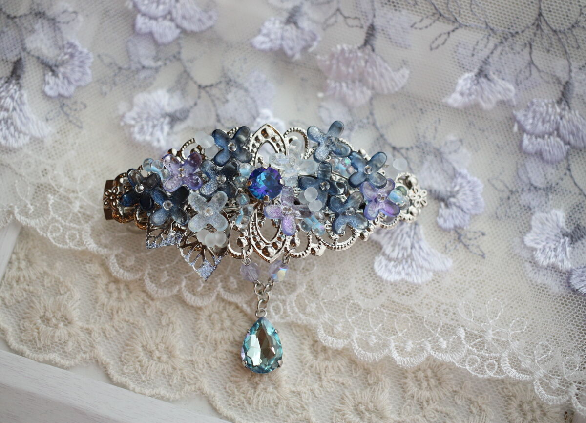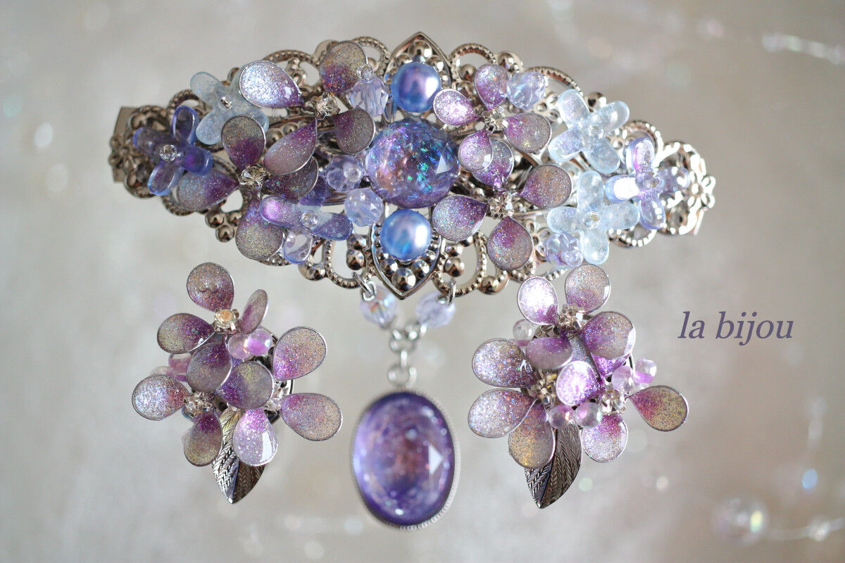 写真のバレッタとイヤリングのセットは、夢色の紫陽花をイメージ。