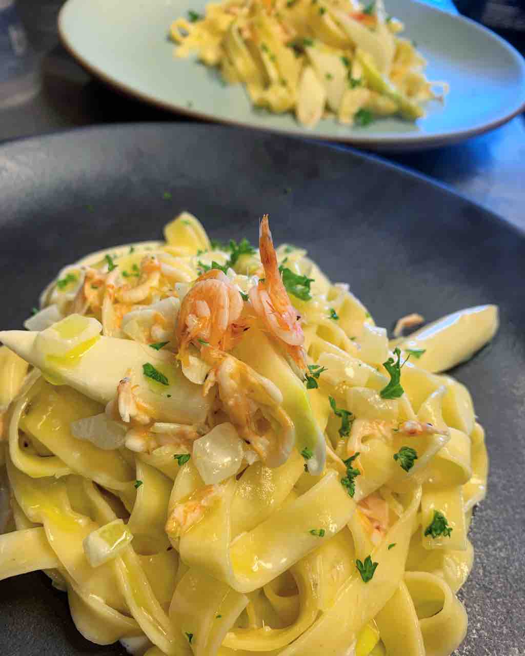 『桜海老とホワイトアスパラガスのクリーム 生パスタのフェットチーネ』