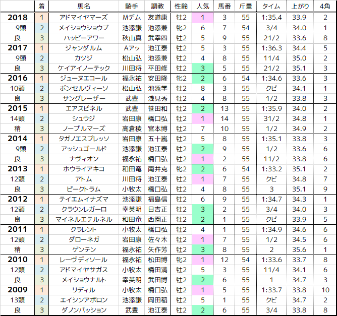 1番人気は10年で3-3-1-3、3番人気以内は17/30。2桁人気の好走は無く、6番人気以内が28/30。高配当を狙うレースではない。