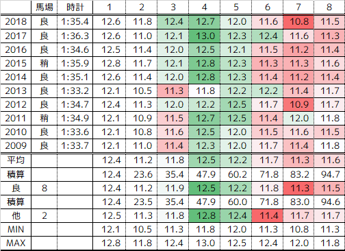 4角2桁番手は10番手からの1頭のみ。4角先頭が5頭好走し、5-6番手以内が大半を占めている。好走馬の上がりは年にもよるが、良なら34秒前後という年が多い。