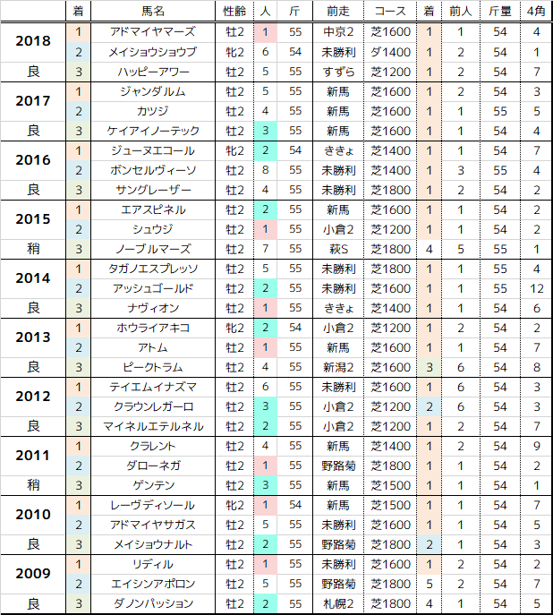 重賞からの馬が6頭。小倉2歳Sが最も多く4頭が好走、前走は3-1-0-0で4角先頭はゼロ。残りは新潟2歳Sと札幌2歳Sで3,4着。