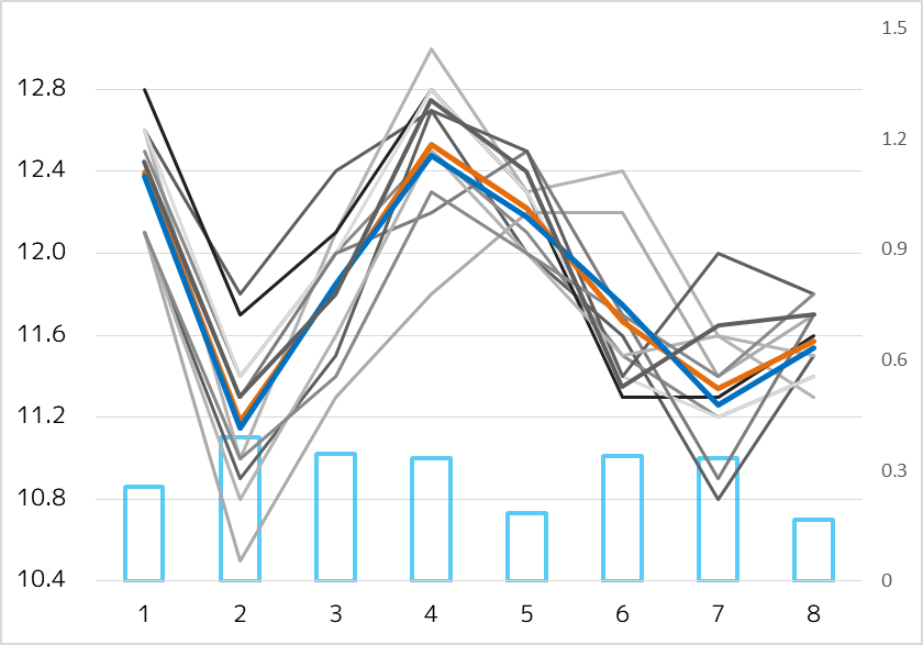 前後半に分けると47.9-46.8とややスロー。