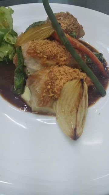 お肉のAランチはカイエットです。簡単にいうとハンバーグ状の料理でして、もともとは豚肉のミンチなどに茹でたほうれん草なんかを混ぜ豚の網脂(クレピネット)で包んで焼き上げたフランス家庭料理がベースになっています。今回は網脂の代わりに豚バラ肉で赤ワインでマリネした赤身の牛肉ミンチを包みマスタードクリームと香り高いパセリとニンニクの香草パン粉をのせて焼き上げています。
