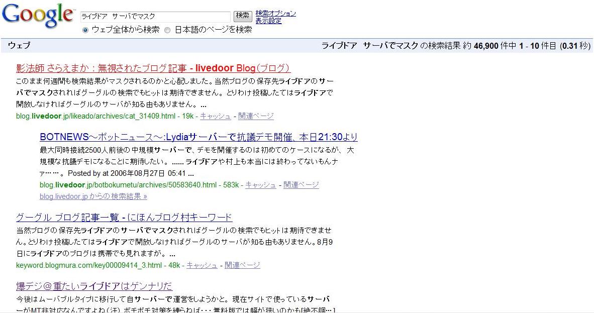 グーグル検索サイトから「ライブドア サーバでマスク」を検索しました。おかげさまで1位でヒットしました。グーグルのサーバには記憶されています。
