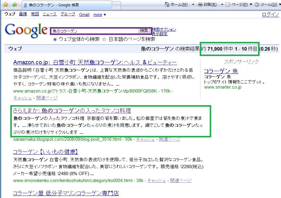 ネットのアリさんは魚のコラーゲン の検索結果 、表示件数を10倍近く変えることで、2ページ以降に追いやるということもなさいました。普段は7万件ほどですが、120万件にして表示を2ページ以降に追いやりその後7万件に戻すこともなさったようです。