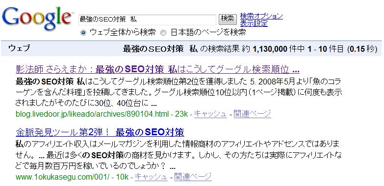 グーグルウェブ検索で「最強のSEO対策 私」をキーワードとして検索しますと、110万件ほどがヒットします。昨日のヒット件数は100万でしたので1日で10万増えた計算になります。まめな人もいらっしゃるようです。
