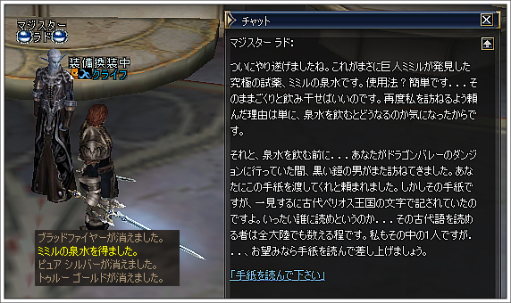 13.ラドに話し掛け、それを飲むとサブクラスの取得が可能となり、報酬としてA-DAIを1枚もらう。(「ミミルの泉水」クエ終了)
