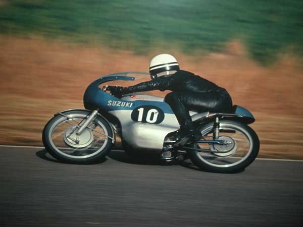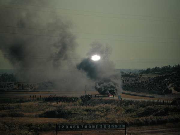 1962年鈴鹿の日本GP、炎上しているのはスズキのE・デグナー、このコーナーは後にデグナーカーブとなる。