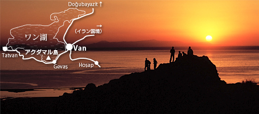 ヴァン湖とは、ワン湖とも言います。トルコ語でVan Gölü。トルコ共和国最大の湖で、イスタンブールから東南東へ1,642キロ、アナトリア東部、イランとの国境付近に位置し、湖面は海抜1,719mです。琵琶湖の5.5倍に当たる3,713平方メートルの塩水湖です。周囲の山々から注ぐ小さな川はいくつかありますが、流れ出る川はありません。インジケファリというニシンの一種が獲れます。湖の東岸にヴァンの町があります。また北西側にはシュプハン山 (4058m) 、南側にはイフティヤル・シャハップ山脈といった、美しい山々に囲まれています。