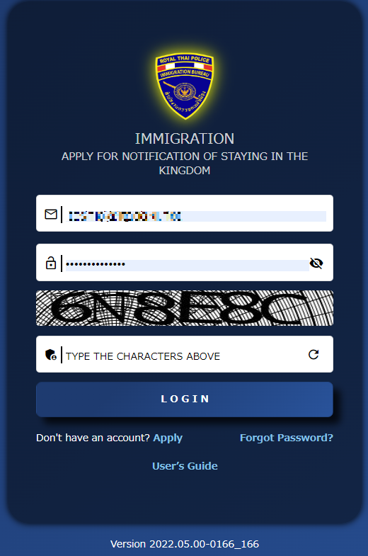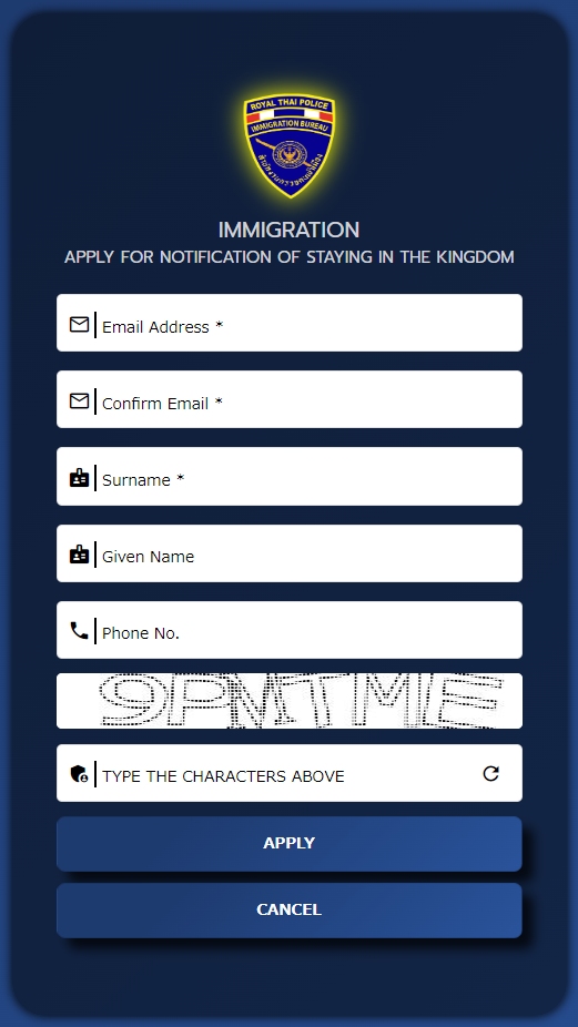 上記文字列をクリックすると90日レポート利用者登録画面が出ます(左の画面)。後は、登録画面の各項目に必要事項を(半角英数字で)入力し、”TYPE THE CHARACTERS ABOVE”と表示されている入力エリアに直前に表示されている読み難い6桁の英数字(6桁の英数字が判読不能な場合には右端の右回転の矢印マークをクリックすれば別のパターンの英数字に変わります)を入力し、そのすぐ下の”APPLY”タブをクリックすれば、利用者登録情報が送られ、数日中(その時の状況により半日〜1週間程度かも)に登録したeメールアドレスにイミグレーションからパスワードやその他の情報が記載されたメールが送られてきます。