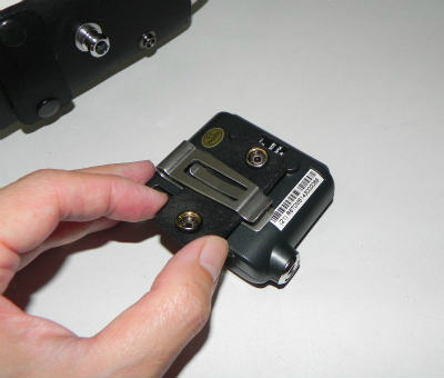 今回は、スペース的にも、トランスミッターのベルトクリップがうまく差し込めるような金具類の利用ができなかったので、革製のホルダーを使って、クリップで取り付けるようにしてあります。