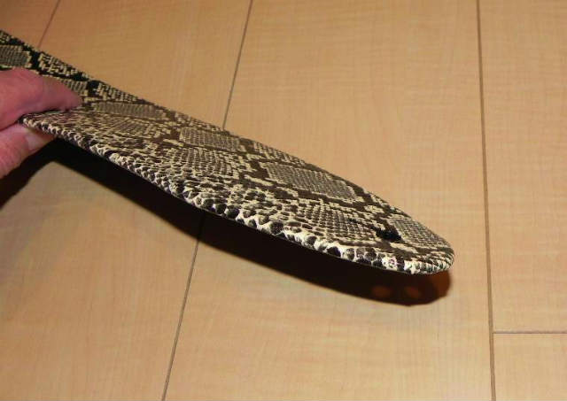そしてもう1つ、今回の品のバリエーションとして、合皮ながら、本革リアルタイプと同様に、本体部をパイソン革で包み込む構造の、「合皮リアルタイプ」も合わせて発売しております。