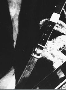 レス・ポールのエンド部のストラップピン周りがわかるわけですが、ストラップは、直接にネジ止めされ、ガッチリと固定してあるようで、一度ひねられたようになった上で垂れさがっています。(垂れ下がっている部分については、ストラップの裏面が見えているということです。)