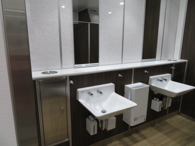 洗面台はTOTO製CeFiONtect仕様の壁掛ハイバック洗面器(新型)LS135DMを2台使用しています。蛇口は自動水栓アクアオート発電タイプ(TENA125AW)を使用しています。液体石鹸も備え付けられています。フックも設置されています。中央に手指乾燥機(クリーンドライ高速両面タイプ)が設置されているほか、両端のライニングにゴミ箱が組み込まれています。洗面台は1台減ってしまっていますが、このスペースならゴミ箱を1か所だけの設置にして一回り小さいLS125系を使用すれば3台設置できたのではないかと思います(ただ、LS125系の石鹸対応モデルは蛇口が右に寄ってやや使いにくいのが難点だが…)。