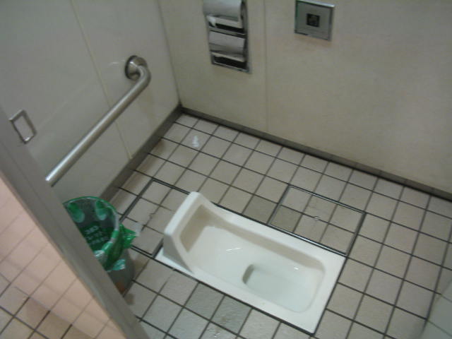 一番手前の1室は個室内にベビーチェアが設置されているほか、手すりがI字型ではなくL字型のものになっていました。*TOTO C550NU=C550SU(2004年12月発売、標準洗浄水量8L)を洗浄水量6Lで使用できるように改良した機種。今年4月1日の出荷分よりC550SUから切り換える形で発売。外見は全く同じで、見分けることは困難。構造は従来のフチ裏あり・ボックスリム構造・複数穴吐水のまま。