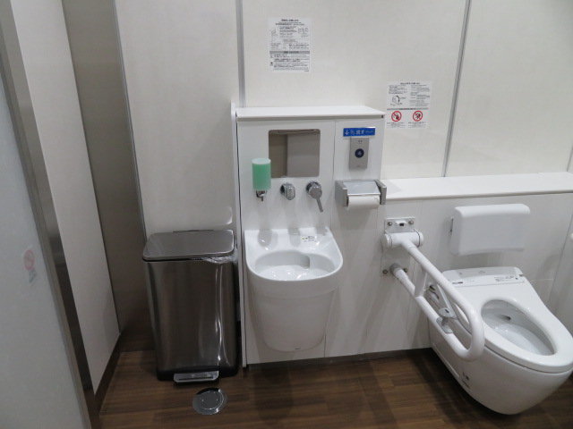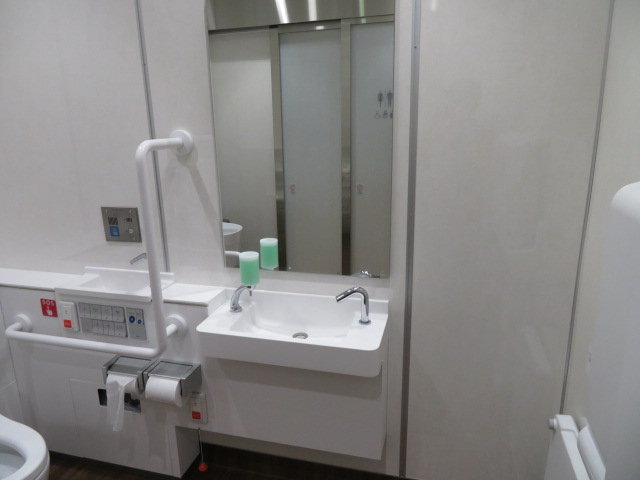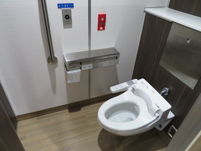 多機能トイレ(だれでもトイレ)です。便器はTOTO製CeFiONtect仕様の壁掛式ニューボルテックス便器CU467Pを使用していました。洗浄装置は光電センサー式フラッシュバルブ(オートクリーンC)を使用していました。小型手洗器、オストメイト用洗浄水栓(便器上面設置の固定式)も設置されていました。洗面台はTOTO製CeFiONtect仕様のL270Dを使用していました。蛇口は自動水栓アクアオート(TEL70BX)が設置されていました。器具配置は右勝手となっていました。一般トイレに2011年頃に温水洗浄便座が設置された後も、多機能トイレには温水洗浄便座が設置されませんでした。