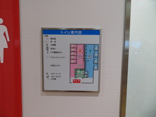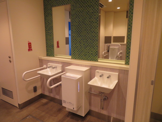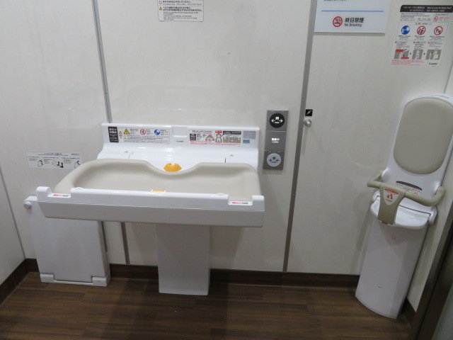 また、もう1点残念な点として、多機能トイレ(だれでもトイレ)のベッド系設備が多目的シート(介助ベッド)とはならずベビーシート止まりとなってしまった点も挙げられましたが、これはここの多機能トイレが狭いので、そもそも多目的シート(介助ベッド)を設置するほどの余裕が取れなかった可能性もありそうです。