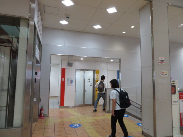 新しいトイレは従来のトイレの真向かいということで、改札口を入って右奥の下り1・2番線ホームに下りるエレベーターの手前に移りました。入口には音声案内装置も設置されています。
