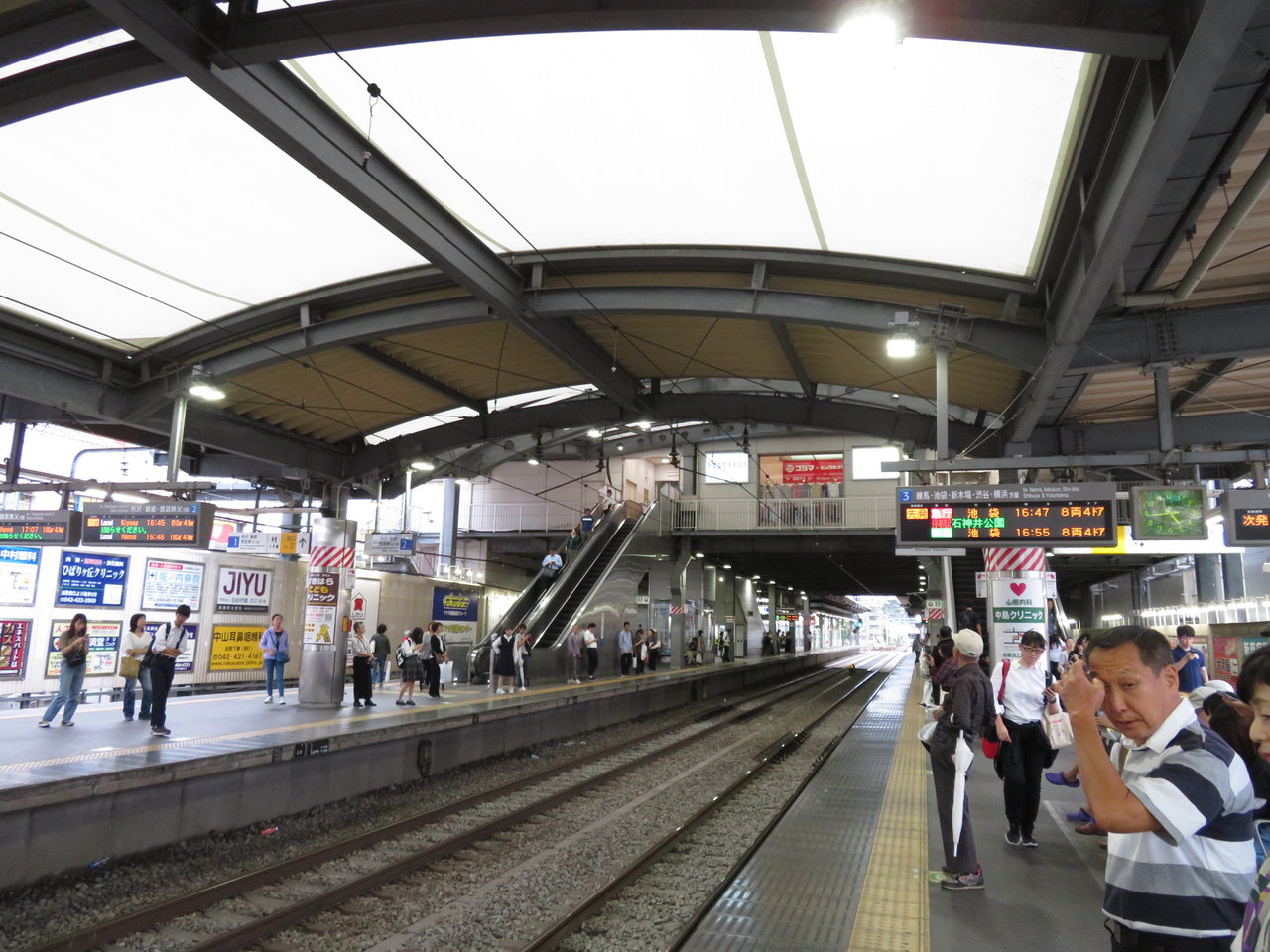 橋上駅舎2階部分(エスカレーター上)から見下ろしたホーム・線路です。30000系は2番線に入線する下り電車です。もちろんこの工事の時にトイレも改修されているので、当駅のトイレはそれほど古いものではありませんでした。