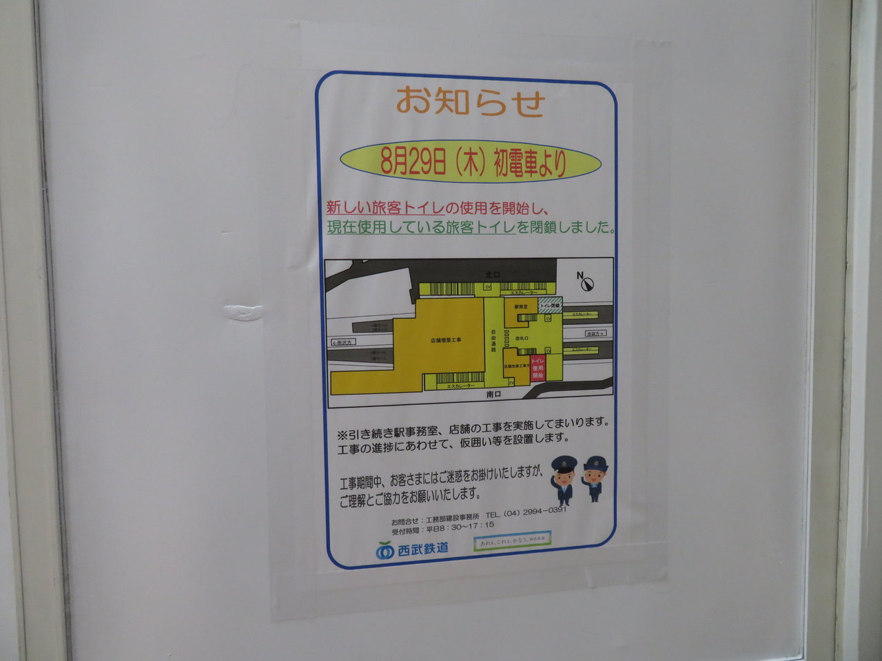 西東京市にある西武鉄道池袋線ひばりヶ丘駅では、2018年度末から2020年度にかけて、駅舎のリニューアル工事が実施されており、トイレの改修工事も行なうと告知されていました。このトイレ改修(表題の通り、実際には移転)工事が8月末に竣工していたとの情報を8月末に他サイトで入手しており、今回イベントの打ち合わせで出身高校に行った後に新トイレを見てきました。