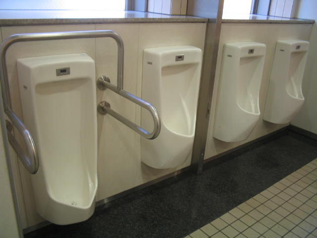 小便器はTOTO製CeFiONtect仕様の「小便器ユニット」(光電センサー式フラッシュバルブ・ジアテクト内蔵)、UTEU23D(リップ高さ350mm・陶器部品番UU721DRU)を1台(一番左側)とUTEU13D(壁掛式・陶器部品番UU521DRU)を3台の計4台使用していました。一番左側の1台(UTEU23D)には手すりを併設していました。2007年秋ごろにフックが追加されています。