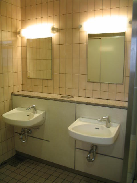 洗面台はTOTOのL230DSを使用していました。入口から見て右側に2台(この写真)、左側に1台で計3台設置されていました(このような配置になっていたのはパーティションで区切れる構造を取っていたため)。蛇口は自動水栓アクアオート(TEL70BX)でした(後に一部TEN40AXに取り替えられていた気がする)。中央のライニング内側にゴミ箱が設置されていました。また、後に2007年秋ごろにフック、2009年度下期に液体石鹸が追加されています。