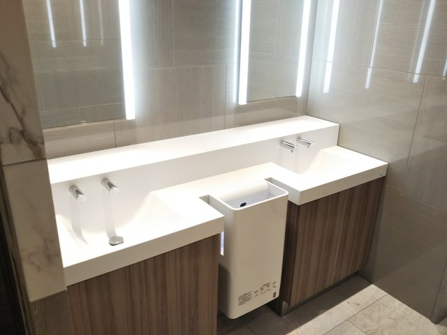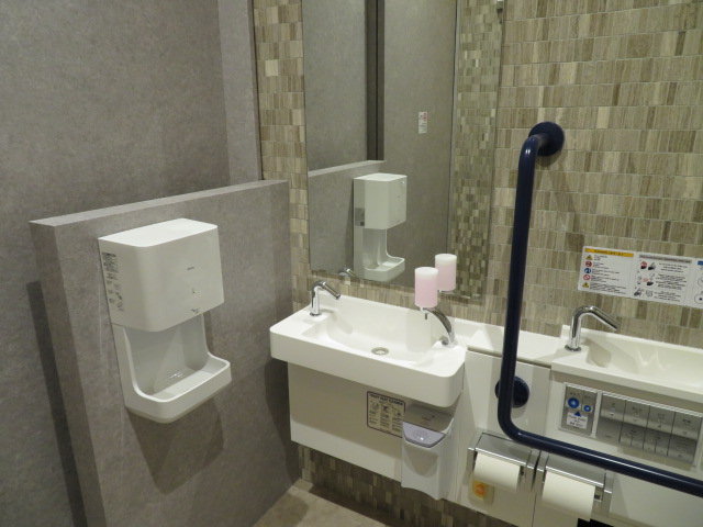 洗面台はドイツの名門メーカー・ビレロイ&ボッホ(Villeroy & Boch)社製で、大皿のようなベッセル型のものを使用しています。2台設置されています。ビレロイ&ボッホ社製の衛生器具は日本ではセラトレーディング(TOTOグループ企業)や、リラインスが販売取次を行なっています(この洗面器はセラトレーディング品番VB514400と思われる)。蛇口は自動水栓アクアオート(セラトレーディング扱い・サーモスタット混合栓、CET940Tと思われる)です。自動液体石鹸装置(オートソープディスペンサー)、手指乾燥機(クリーンドライ高速両面タイプ)も設置されています。