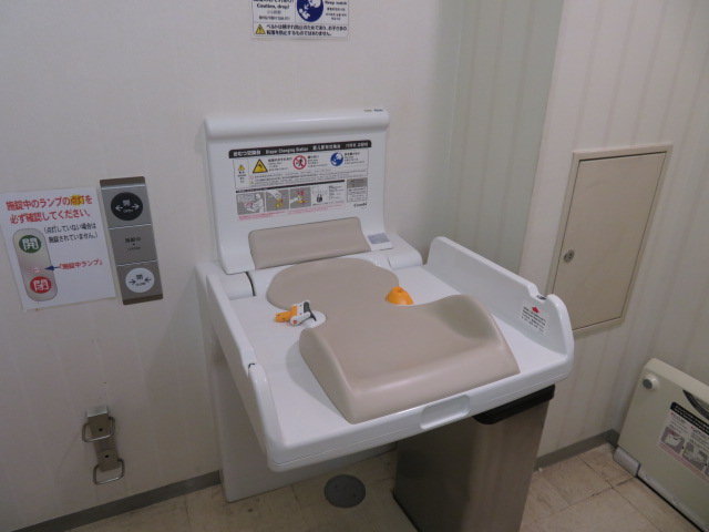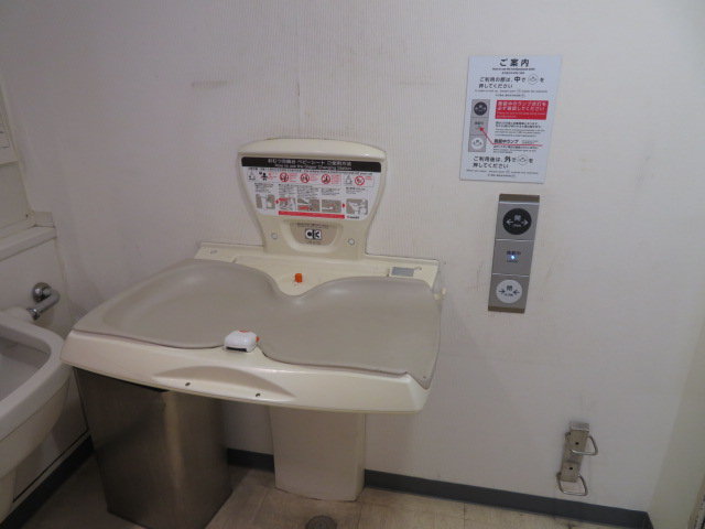 多機能トイレ内にはベビーシートも設置されています。ベビーシートはCOMBI製です。先ほどの地下1階多機能トイレにあったものと比べると少し古いモデルです。