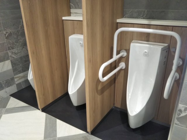 小便器はTOTO製CeFiONtect仕様の自動洗浄小便器UFS900JCS(リップ高さ350mm、「きれい除菌水」・掃除口付)を3台使用しています。1台には手すりを併設しています。フックも設置されています。1台ずつ間仕切りも設置されています。