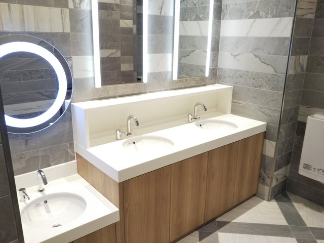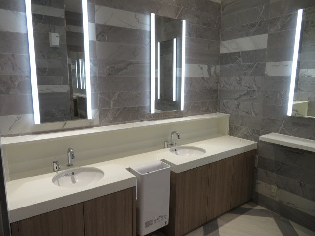洗面台はカウンター式で、TOTO製CeFiONtect仕様の円形洗面器L530を3台使用しています。L530は2007年頃の発売で、これまで洗面台といえば楕円形が主流でしたが、正円形のボウル形状が発売当時斬新に感じたものでした。蛇口は自動水栓アクアオート(サーモスタット混合栓 TENA22A)です。写真一番左側(入口側から見ると一番奥)の1台は子ども用で、低い位置に設置されています(鏡もそこだけ円形になっている)。内装はグレーを中心とした大理石調になっています。手指乾燥機(クリーンドライ高速両面タイプ)も設置されています。