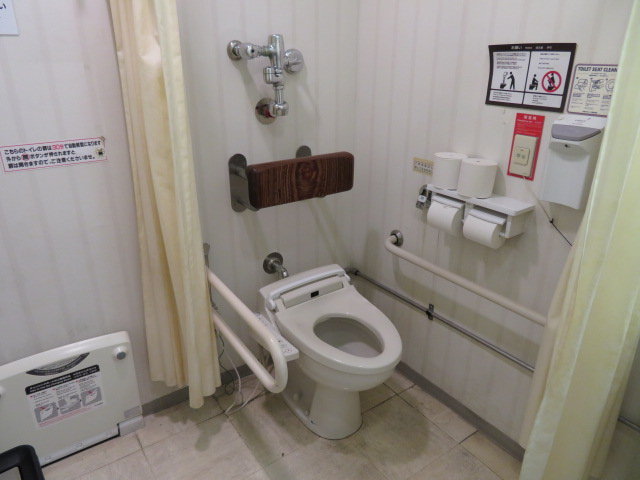 多機能トイレです。便器はLIXIL(INAX)の車椅子対応サイホンゼット便器C-5K(上面高さ417mm、TOTOのC48ASに相当)を使用しています。洗浄装置は靴べら(ソフトレバー)式スイッチのフラッシュバルブです。便座はシャワートイレ(KB21タイプに似ているがやや異なる。量販店モデル?)です。背もたれはずいぶん高い位置に設置されており、むしろ肩か首に当たるような位置の気がします。カーテンが設置されています。器具配置は右勝手です。