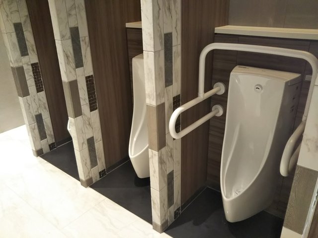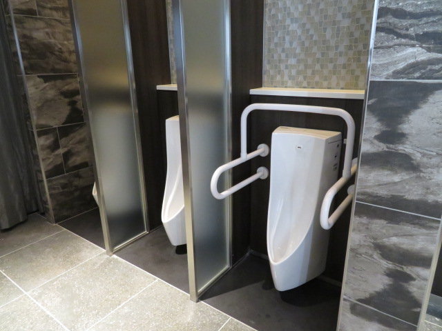 小便器はTOTO製CeFiONtect仕様の自動洗浄小便器UFS900JCS(リップ高さ350mm、「きれい除菌水」・掃除口付)を3台使用しています。一番手前の1台には手すりを併設しています。フックも設置されています。やはり1台ごとに間仕切りが設置されています。内装はここも大理石調になっています。