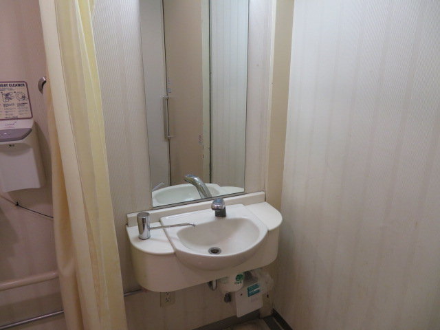 多機能トイレの洗面台はLIXIL(INAX)のL-62AGを使用しています。蛇口は自動水栓オートマージュです(建設当時販売されていたモデル)。やはり多機能トイレには手指乾燥機が設置されていませんでした。