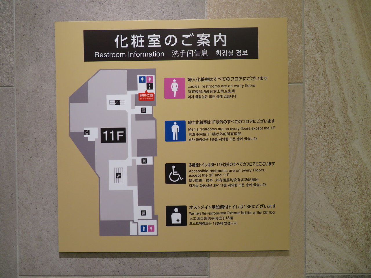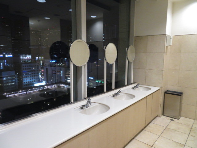 一方で残念であった点としては、今般の改修では期待していたオストメイト対応設備の拡充が行なわれなかったことが挙げられます。現状では当物件におけるオストメイト対応のトイレは先に述べた13階南側の1か所(未改修)のみであり、近隣の各デパートも大体オストメイト対応のトイレは2〜3か所程度(ルミネ1・2はまだない)なので、特別ここのオストメイト対応トイレがほかの各店に比べて少なすぎるということはないですが、ことここに関してはそれらの各店(NEWoManは別として)に比べて建物が新しくて多機能トイレの数も多く、さらに今回多機能トイレを改修したのに、オストメイト対応設備の追加が行なわれなかったのは残念な限りでした。13階の1か所だけでは低層階にしか用のない人はわざわざ上がる必要があって不便であり、また1つしかないためほかの客で塞がっているとわざわざ13階まで行った上にさらに待ち時間が発生したり、あるいはほかの物件に移動する手間がかかります。また、今後13階南側のトイレを改修するようなときに一時的に当物件からオストメイト対応トイレが消滅する可能性もあります。