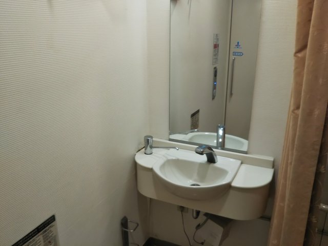 多機能トイレです。この個室では便器が取り替えられており、LIXIL(INAX)製ハイパーキラミック仕様の車椅子対応サイホンゼット便器C-5KR(TOTOのC480ANに相当)を使用しています。洗浄装置は靴べら(ソフトレバー)式スイッチのフラッシュバルブです。便座はシャワートイレPB(「流水音」付*)CW-PB11Fです。やはり妙に高い位置に背もたれが設置されています。カーテンが設置されています。器具配置は左勝手です。