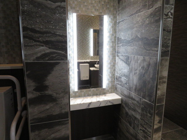 洗面コーナー向かいに鏡とカウンターを備えた身だしなみコーナーも用意されています。このトイレも石造り風の内装で、高級感あふれる雰囲気です。カウンターは洗面台より低い位置となっています。