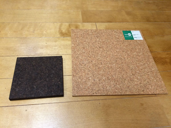 ▲左が浴室用コルクタイル。右が居室に使うコルクタイルです。