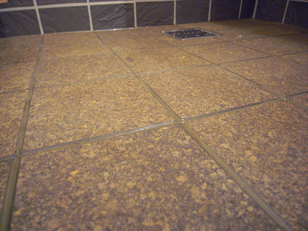 ▲水にさらされることで若干の伸縮があるので、目地を切って張ります。壁のタイルの目地とピッタリ合っていますね。