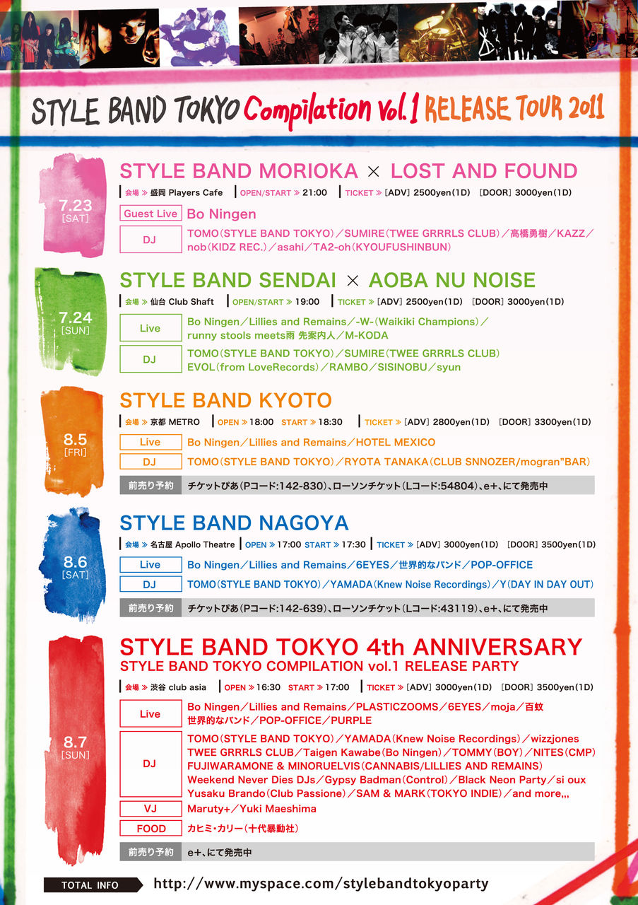 また今回のコンピレーションの発売に伴い、STYLE BAND TOKYOでは再来日するBo Ningenらと共に盛岡、仙台、京都、名古屋でリリースツアーを行い、8月7日渋谷club asiaではコンピレーションのリリースパーティーを行うので是非こちらもチェックして頂きたい。
