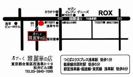 美味しお料理とお酒を楽しみながら、仲間とワイワイ出来る『居酒屋』 お酒を飲みながらカラオケで歌ったり、友人やスタッフと会話を楽しめる『スナック』 そんな両方の良さを併せ持った、新しいスタイルのお店が『居ざっく』です。 元浅草ロック座トップスターの雅麗華がママを務める『居ざっく雅麗華の店』に皆様、是非お立ち寄りください。 ■「居ざっく雅麗華の店」は、国際通り沿い、浅草ビューホテルより50Mほど田原町駅寄り、中華料理「福臨苑」のビル3階です。 ・住所 : 台東区西浅草3ー1ー9 松井ビル3階 ・電話番号 : (03)3845-7099 ・営業時間:19時~24時 ・定休日:日曜日、祝日 ★料金設定 ・男性3,000円 ・女性2,500円 ※60分飲み放題・カラオケ無料 ※お時間を気にせずに飲めるボトルキープもあります。お食事もお楽しみ頂けます ※ご宴会も承ります(要ご予約)