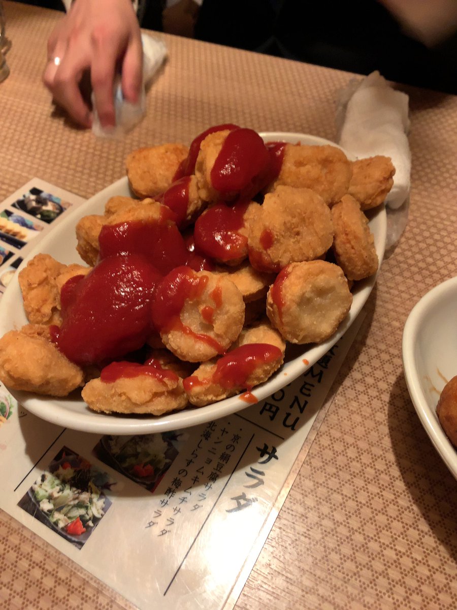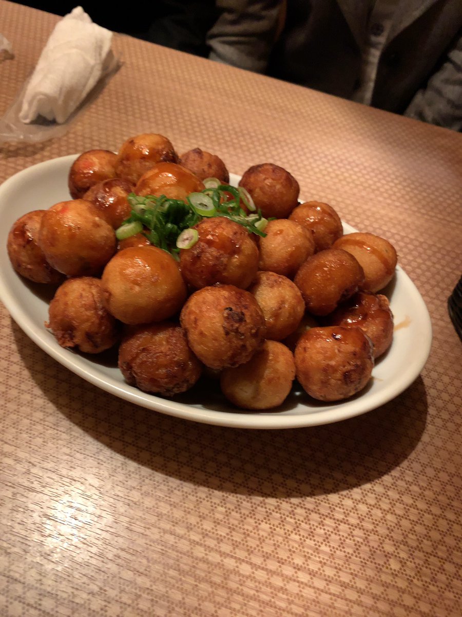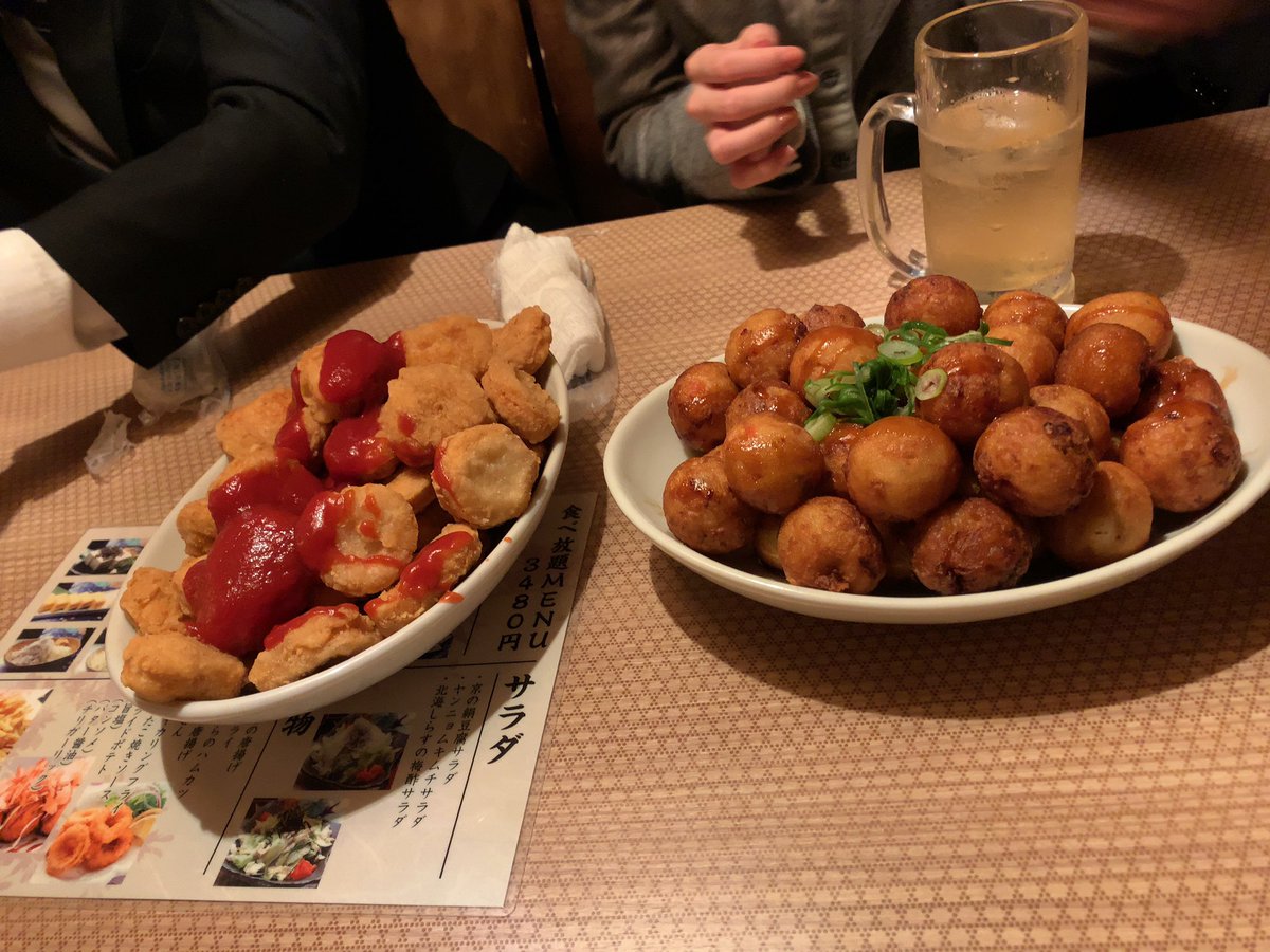 「食べ放題メニューはお通しのたこ焼きとフライドチキンを全て召し上がって頂いてからご注文出来ます」と言って出されたたこ焼きとフライドチキンの量の多さよ。