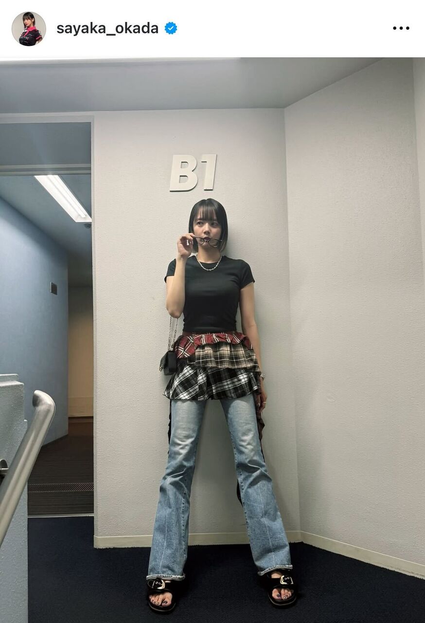 岡田は「sheinのスカート褒められた スタイルよく見えるね!加工はしてないよん」とつづり、ボディーラインが強調された黒の半袖Tシャツに、デニムのパンツの上からスカートを合わせたコーディネートを披露した。