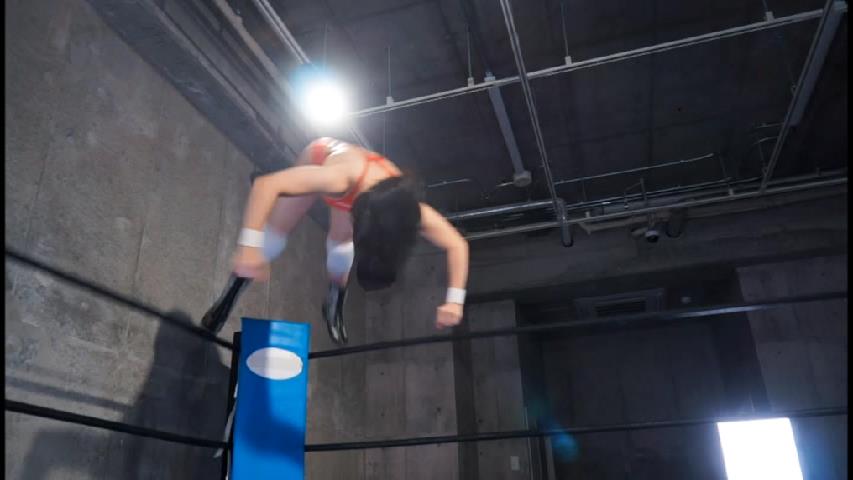 みいなをコーナーに追いやったいちごは、空中ネックシザーズでみいなを絞めます。