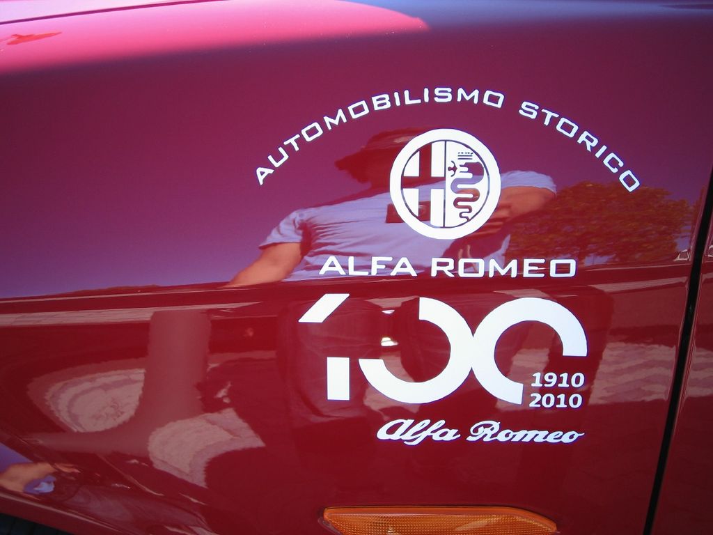新旧19台のアルファが出発地に集合しました。参加車両には特製のリボンが装着されます。100周年ロゴのステッカーをあしらった熱心なアルフィスタ達も!